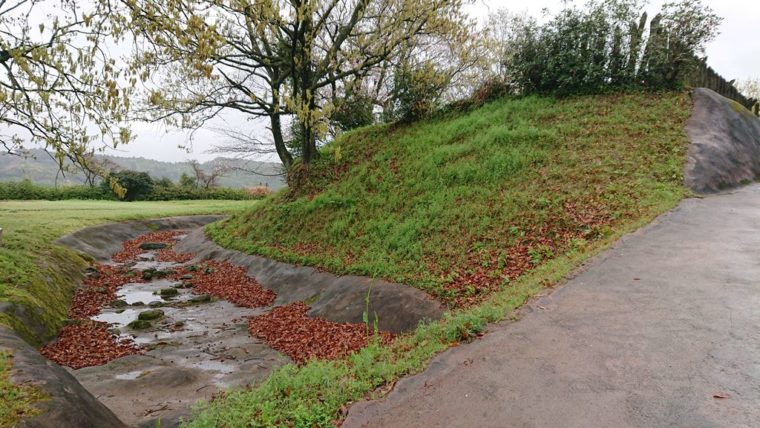 宇土古城の内堀の特色のもうひとつは、未完成の堀底が検出されたということ。城門に向かって右側、方角でいうと北側は、堀底がでこぼこしている。これは未完成の堀の工事跡だそうです。