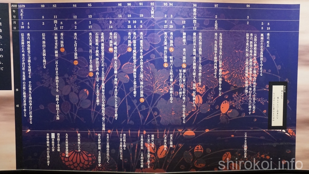 興味深いのは慶長元年(1596年)の慶長伏見大地震の時には御殿が大破したということで、有馬の湯は熱湯になって入湯不能になったとのこと。自然のことだけは秀吉の思うままにはならない。