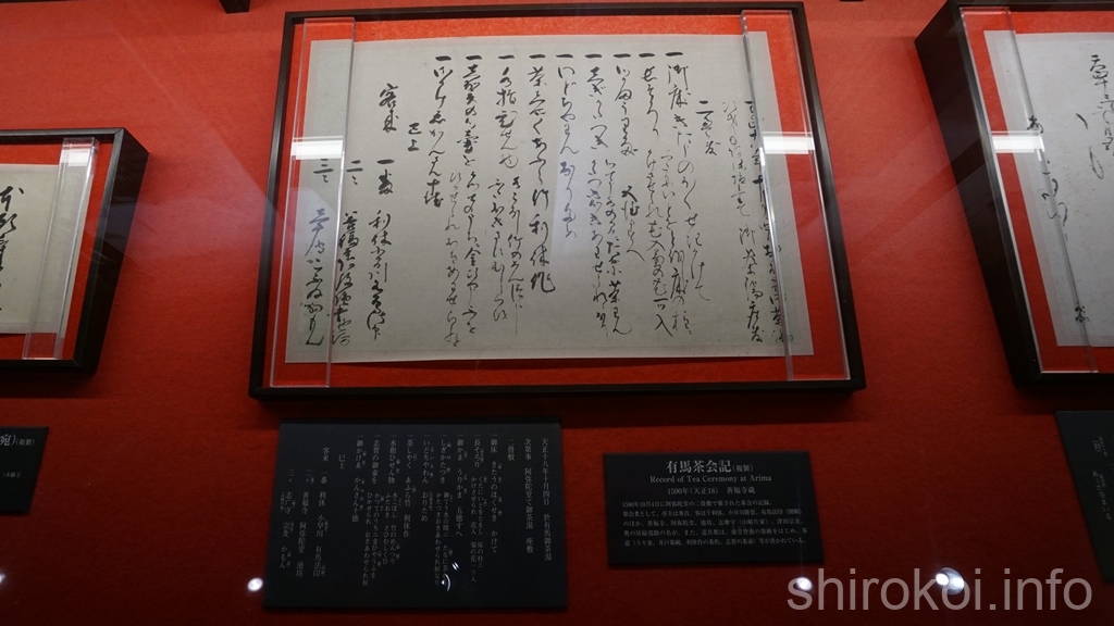 秀吉の奥方のねねさんからの寄進状だったり、有馬で行われた茶会の記録だったり。この茶会の記録によると亭主は秀吉、客は千利休に小早川隆景、津田宗及とまぁ、すごい面々。