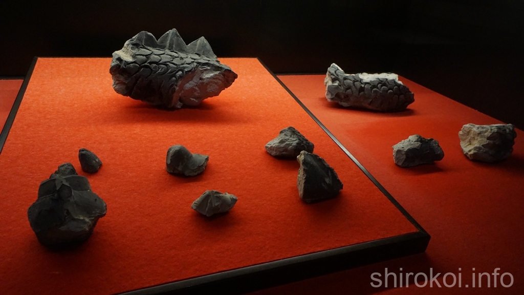 そして黒い囲碁の碁石。黒い碁石は那智黒石で作ったもので、自然石をそのまま使っていたようだ。白い石は朝鮮蛤で作られていたが、貝はカルシウムのかたまり。400年の間で酸性の土の中で溶けてしまい、黒石だけが残ったということらしい。