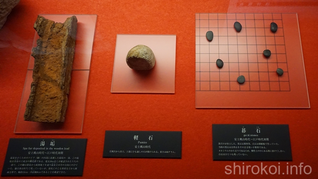 左から湯垢のかたまり(温泉部を運んでいたパイプである樋は朽ちて無くなっている)、軽石、碁石。